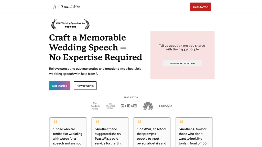 ToastWizは、忘れられない結婚式のスピーチを簡単に作成するために設計されたAIツールです。個人の詳細や思い出を提供することで、ユーザーは数分以内に3つのパーソナライズされたスピーチ草案を生成できます。ToastWizが使用するAIモデルは、スピーチが明確でよく構成されているだけでなく、共有された物語に基づく個別のタッチも持っていることを保証します。価格は29.99ドルで、ToastWizは、新郎の付き添いや花嫁の付き添い、親など、さまざまな役割に対して記憶に残るスピーチを書くためのストレスのない解決策を提供します。ユーザーは、結婚式のセレモニーで自信を持ってスピーチを行う前に、それを練習して洗練させることができます。ライティングブロックに直面している場合や、心からのスピーチを書く手助けを探している場合でも、ToastWizは特別な日の本質を捉えたスピーチを作成するための頼りにできるAIツールです。
